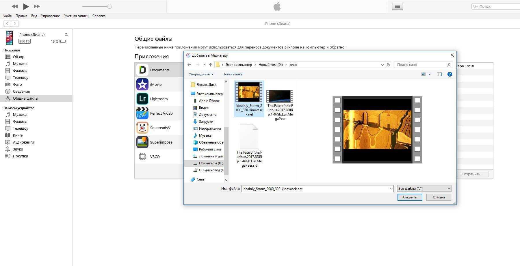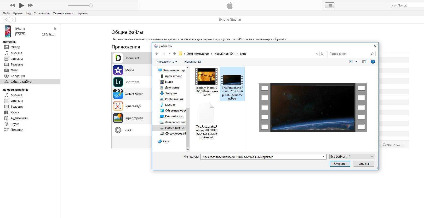 В открывшемся окне выбираем необходимое видео в любом формате, нажимаем еще раз «Добавить», ожидаем, пока видео скопируется на устройство, после чего останется запустить приложение на iPhone или iPad и наслаждаться просмотром.