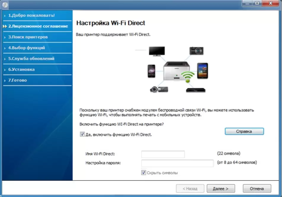 Только после этого включаем его. Нажимаем «Далее» — осуществится установку принтера. В моем случае пройдет установка и запустится настройка беспроводной WiFi-сети ( Запускать её не нужно! Для начала перезапускам наш принтер ) и мы можем переходить к настройке беспроводной сети.