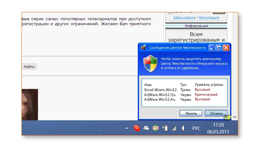 Еще один распространенный способ получить вирус в Интернете — это когда вы видите на каком-либо сайте всплывающее окно или даже окно, похожее на ваш «Проводник», сообщающее вам, что на вашем компьютере есть вирусы, трояны и прочая гадость. Естественно, проблему легко решить, нажав на соответствующую кнопку и скачав файл или даже не скачивая его, а просто попросив систему разрешить вам что-то с ним сделать. Учитывая, что обычный пользователь не всегда замечает, что антивирус вообще не сообщает о проблемах, а сообщения о контроле учетных записей Windows обычно пропускает, нажимая «Да», подхватить вирус таким образом очень легко.