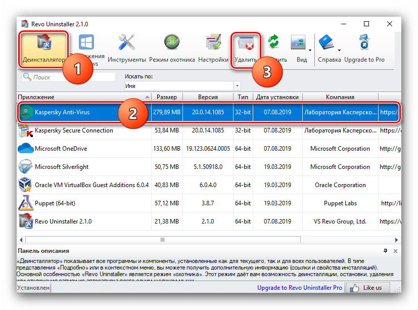 Полностью избавиться от Антивируса Касперского можно и с помощью программ для деинсталляции приложений, в частности Revo Uninstaller.