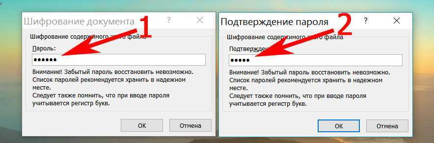 Если мы ставим в нём галочку и нажимаем кнопку Сохранить, то открывается окошко, где надо указать тот пароль, который мы хотим присвоить документу. А затем его повторить.