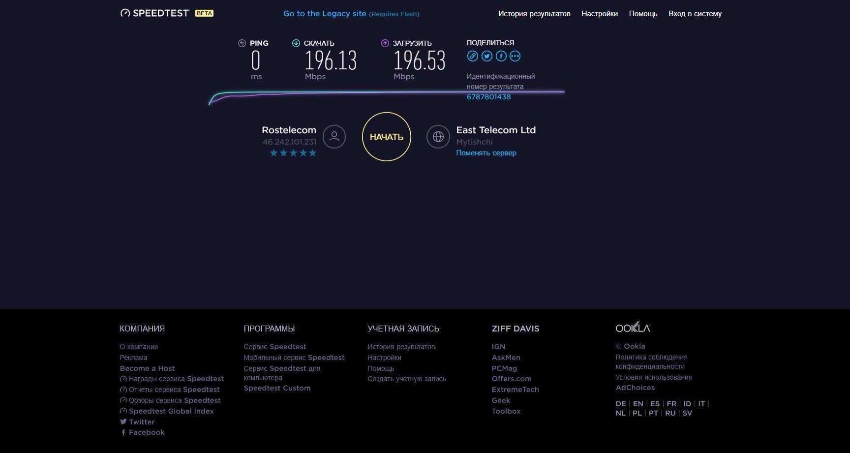SpeedTest — еще один простой бесплатный сервис подобного назначения. Чтобы запустить проверку, достаточно кликнуть кнопку «Начать». Результат отобразится на экране через пару минут.