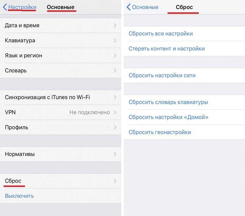 - Перейти в «Настройки» — «Основные» — «Сброс» — «Стереть контент и настройки».