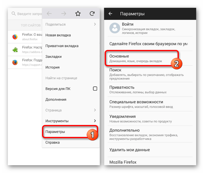 - Несмотря на поддержку магазина расширений, в Mozilla Firefox на Android установить Яндекс стартовой страницей можно только через параметры, как и в других случаях. Для этого откройте главное меню, выберите раздел «Параметры» и перейдите в «Основные».