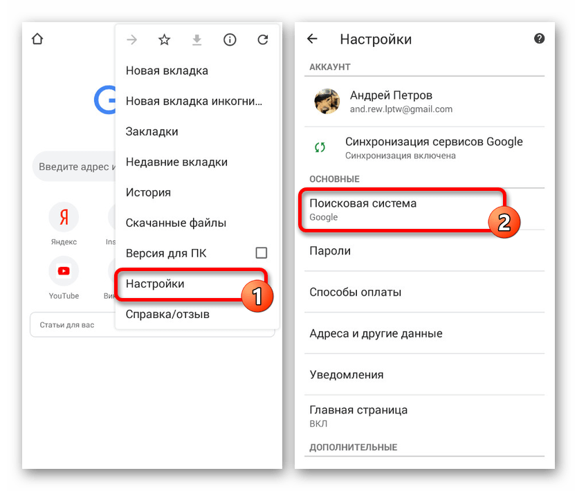 - Как и ранее, откройте Google Chrome, разверните главное меню в правом верхнем углу и нажмите «Настройки». Здесь необходимо найти блок «Основные» и выбрать «Поисковая система».