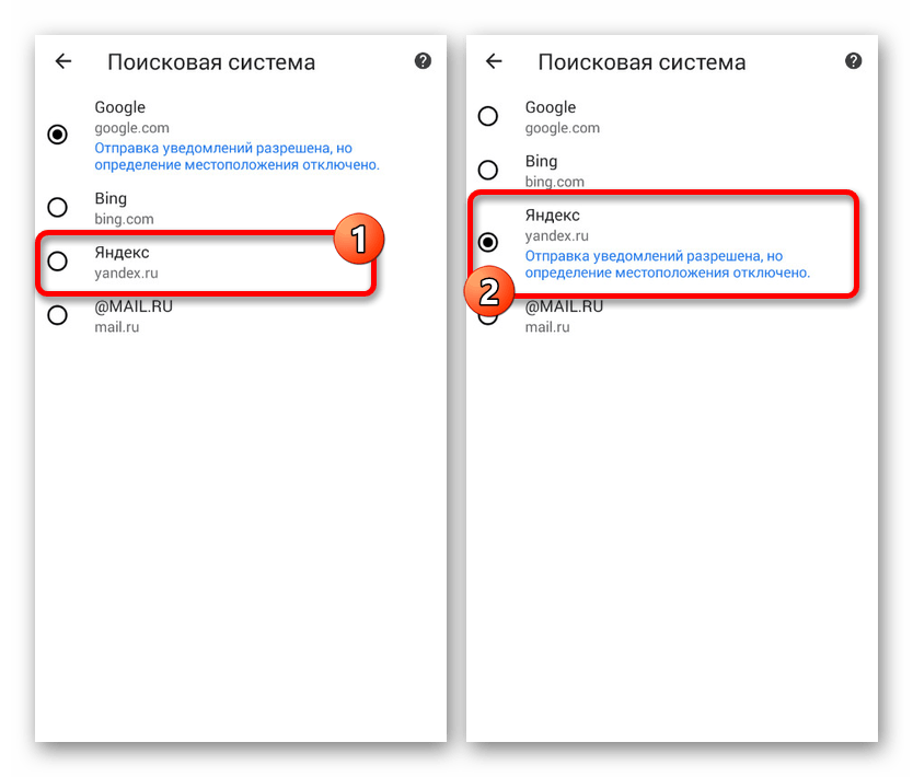 Через появившийся список поменяйте поиск по умолчанию на «Яндекс» и снова вернитесь в раздел «Настройки».