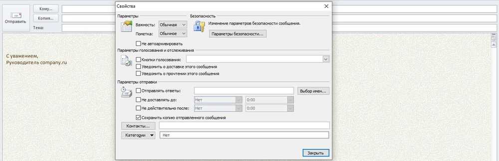 При создании письма в программе зайти в свойства для настройки параметров отправки.