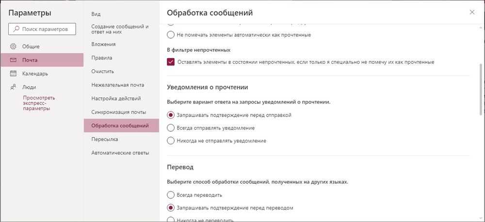 В веб-версии – раздел «Обработка сообщений», но здесь есть только вариант запроса уведомлений о прочтении.