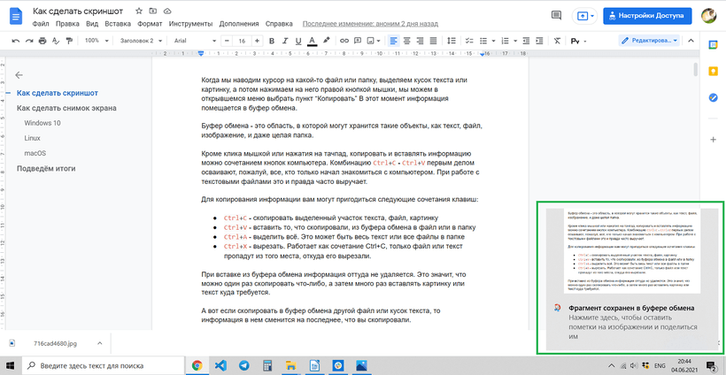 Скриншот сохраняется в буфер обмена. В правом нижнем углу ненадолго появится оповещение о том, что скриншот сохранён, вместе с превью скриншота.