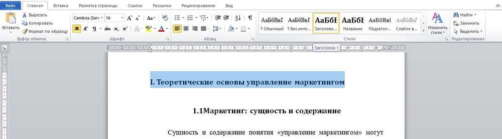 Допустим, в Вашем документе есть заголовки, а в них подзаголовки. Выделите первый заголовок, перейдите на вкладку Главная — Стили . Найдите в списках стилей стиль Заголовок 1 , и щелкните по нему левой клавишей мыши.