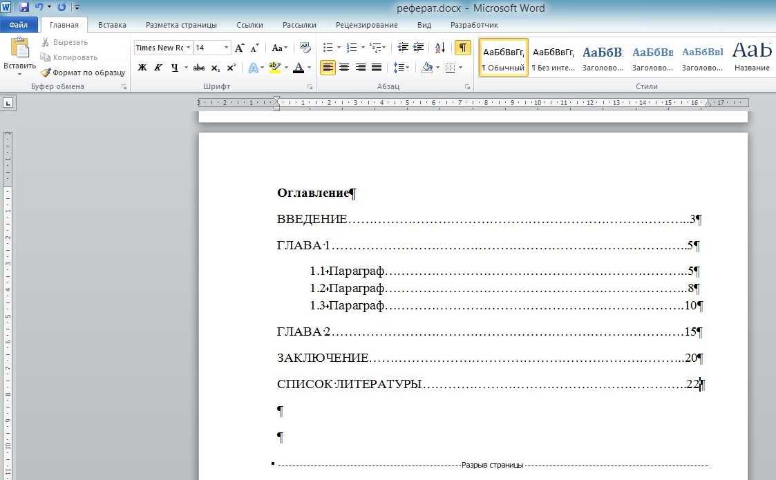 В результате проделанных операций у нас получилось оглавление с теми же самими названиями, что и в тексте; с указанием именно тех страниц, на которых они реально располагаются.
