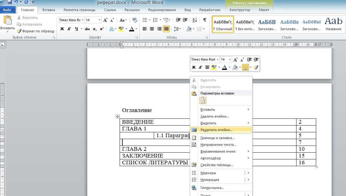 5. Вариантом более сложного оформления является разбиение отдельных строк на дополнительные столбцы. Для этого нужно навести курсор на ту строку, которую нужно разделить на столбцы, нажать правую кнопку мыши и в контекстном меню выбрать пункт Разделить ячейки.
