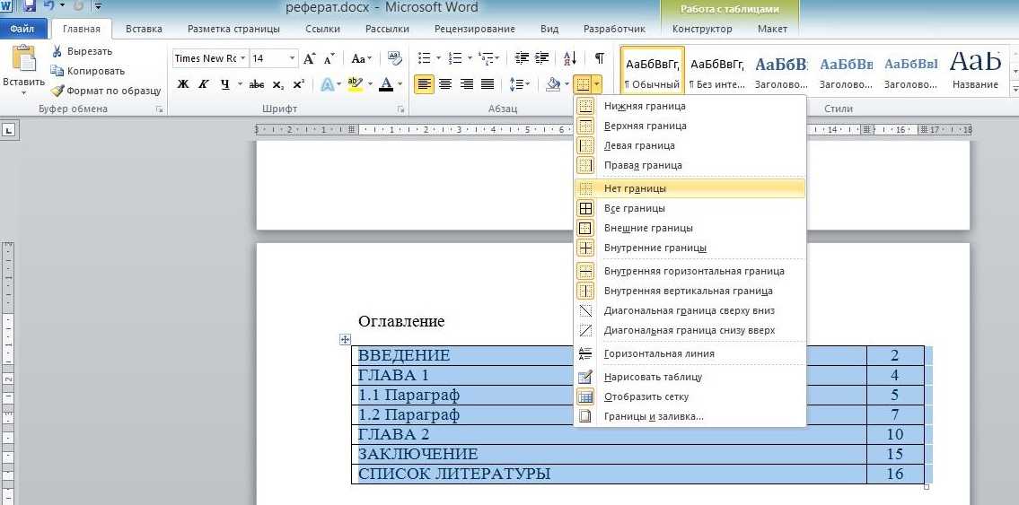 3. Убираем границы таблицы. Для этого выделяем всю таблицу. Меню Главная- Абзац-Нет границы.
