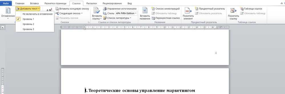 Повторяем процедуру для всех глав, которые будут показываться с номерами страниц. Далее настраиваем подразделы второго уровня: