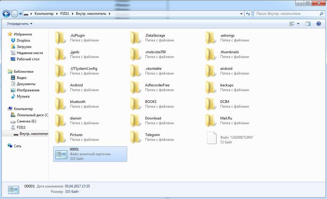 В результате все ваши контакты будут сохранены во внутренней памяти Андроид устройства в виде файла «Контакты.vcf». Дальше этот файл вы сможете скопировать на компьютер, подключив Андроид устройство с помощью USB кабеля.