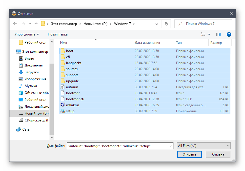 Через стандартный Проводник выделите все объекты, которые хотите поместить в образ, а затем нажмите по «Открыть».