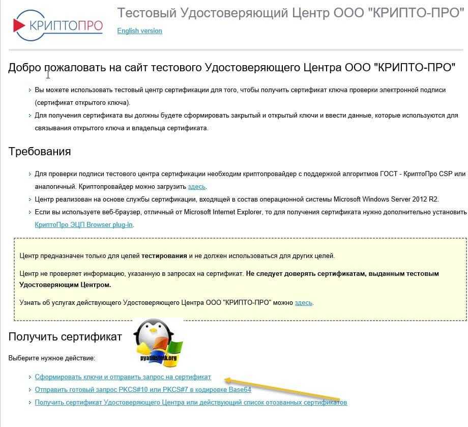 Как я и писал выше вы много, где сможете его применять, я когда знакомился с миром сертификатов и электронных подписей, то использовал тестовые ЭЦП от КриптоПРО для проверки правильности настройки программного обеспечения для работы на электронных, торговых площадках. Чтобы сгенерировать тестовый электронный сертификат, компания КриптоПРО предоставила вам специальный удостоверяющий, виртуальный центр, которым мы и воспользуемся. Переходим по ссылке: