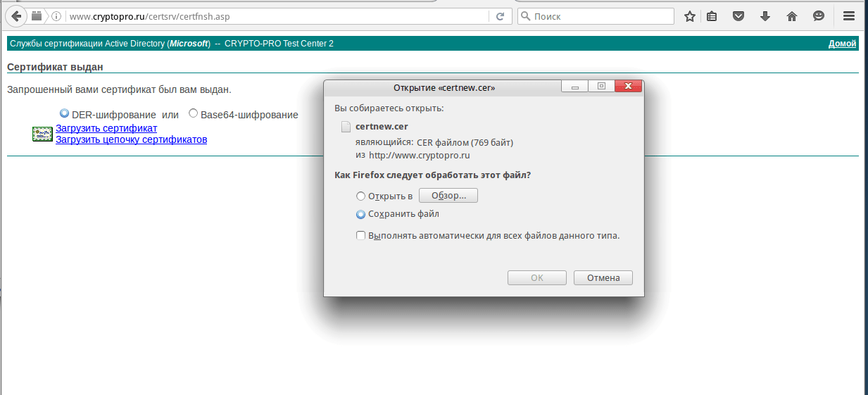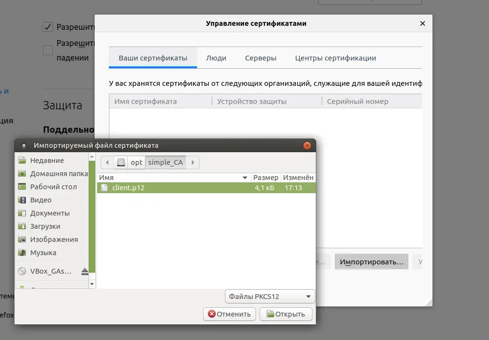 - Выбрать файл с сертификатом и подтвердить импорт.
