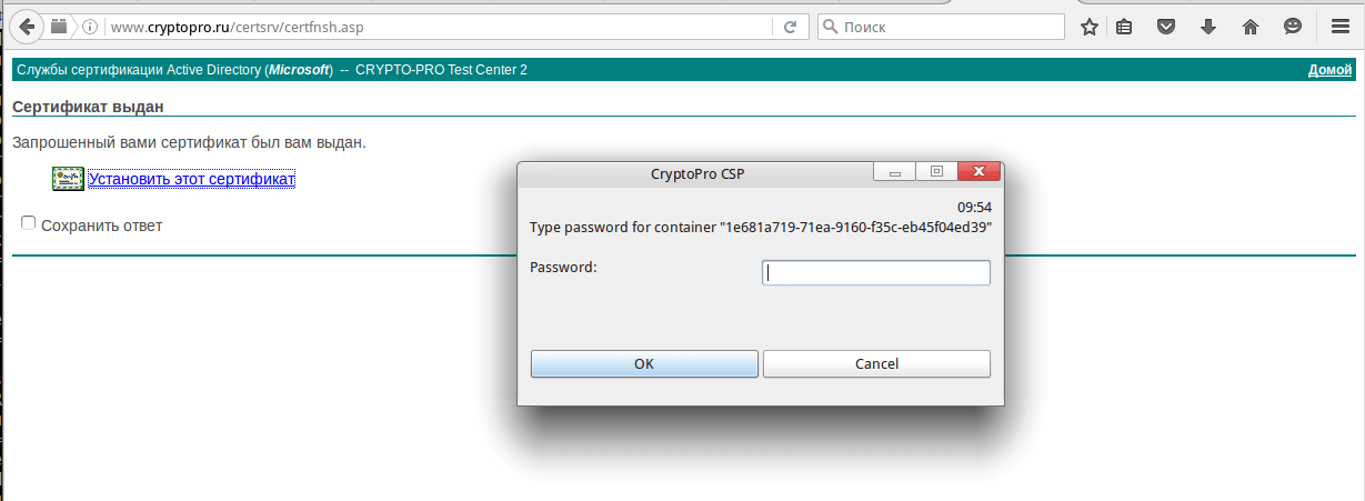 После проделанных действий сертификат автоматически установится и будет размещён в контейнере, расположенном на жёстком диске компьютера, с которого был сделан запрос. После этого его можно скопировать на требуемое устройство. Для копирования контейнера 1 в контейнер 2 можно использовать следующую команду: