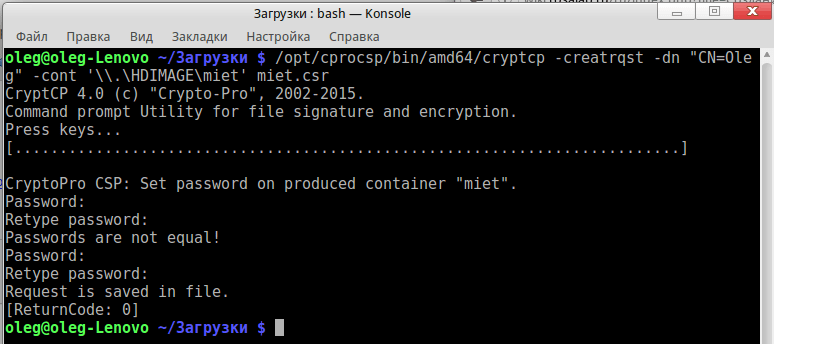 /opt/cprocsp/bin/amd64/cryptcp -creatrqst -dn «список имён полей» -cont «путь к контейнеру» .csr