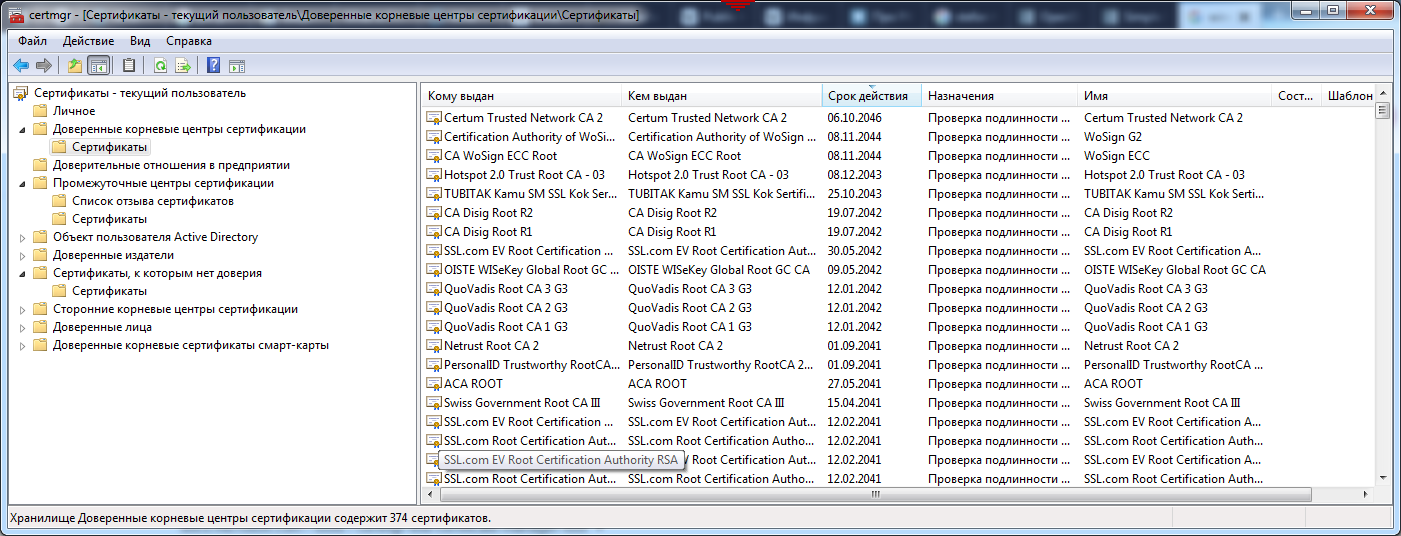 В Windows сертификаты можно просмотреть через оснастку certmgr.msc: