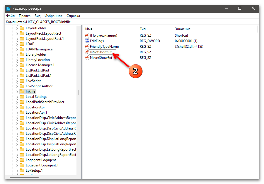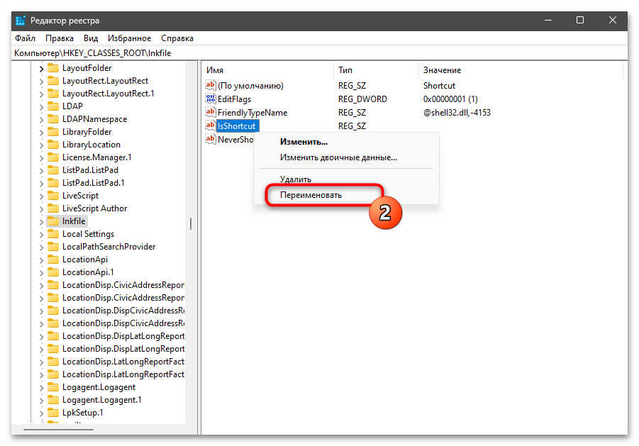 Перемещаемся в область справа «Редактора реестра», щёлкаем ПКМ по наименованию параметра IsShortcut,