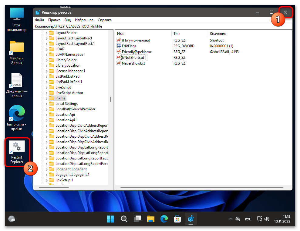 Если нет желания выполнять манипуляции в реестре Виндовс 11 вручную, можно доверить это файлу-скрипту, который привносит необходимые для скрытия стрелок на ярлыках изменения параметров системы автоматически.