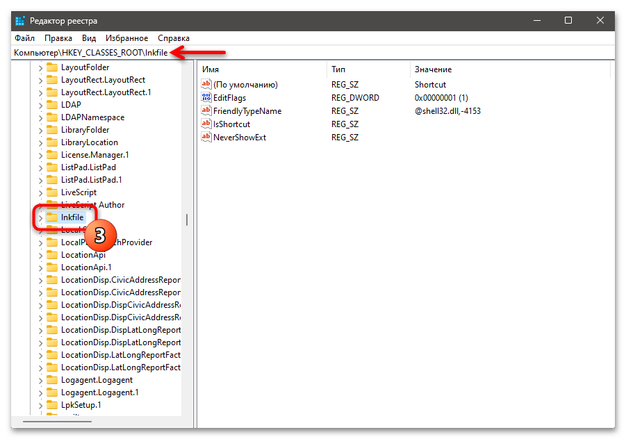 - На всякий случай отметим, что с целью возврата ярлыкам в Виндовс 11 внешнего вида по умолчанию, необходимо кликом выделить созданный по инструкции выше раздел базы данных настроек ОС () в панели слева окна «Редактора реестра», открыть меню «Правка» и выбрать в нём «Удалить»,