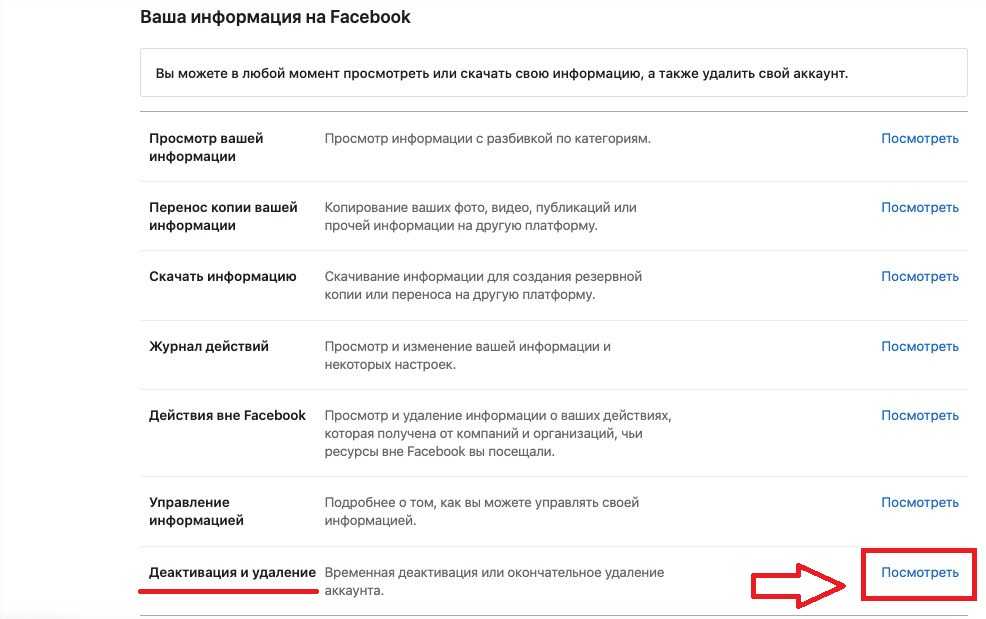 в открывшемся разделе найдите «Деактивация и удаление» и нажмите кнопку «Посмотреть»;