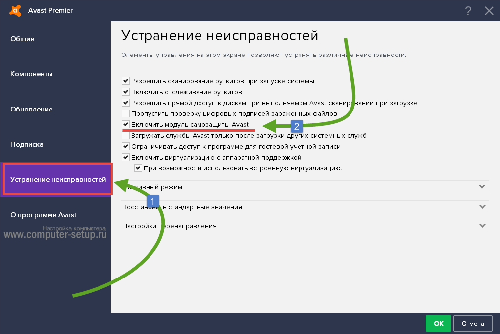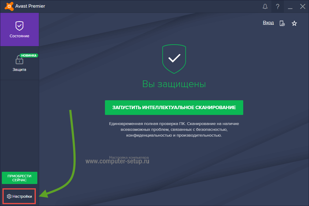 Перед тем, как удалить антивирус с компьютера полностью Виндовс 10 рекомендуется отключить самозащиту в Аваст, чтобы в процессе деинсталляции не возникло никаких проблем.