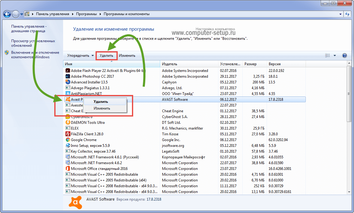 - удаление антивируса Аваст с помощью штатного средства операционной системы Windows стандартным способом
