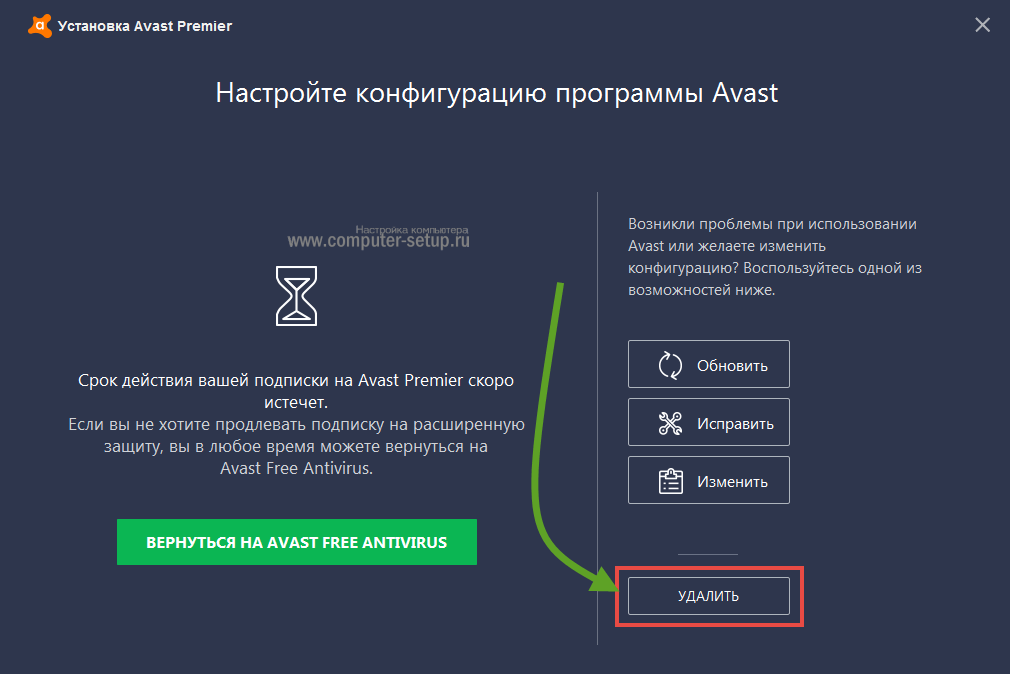 - Когда отобразится окно настройки Avast Free Antivirus, нажмите Удаление.