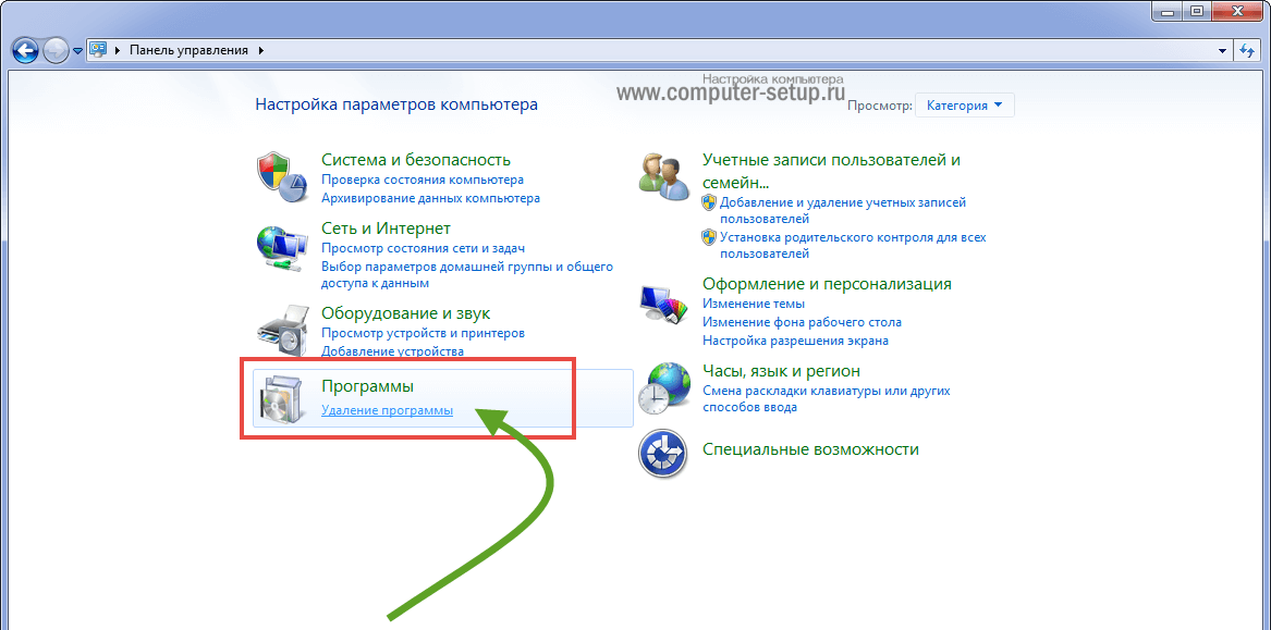- Переключитесь в режим просмотра «Категория» и здесь откройте раздел «Удаление программы».