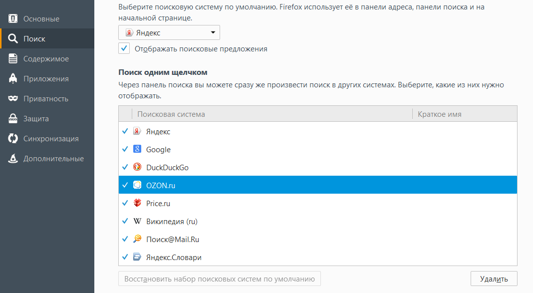 - Firefox — нажмите на значок объявления бутерброд расположен в правом верхнем углу и выберите элемент предпочтения из меню, которое появляется. Затем нажмите на элемент. поиск и выбрать из выпадающего меню Поисковая система по умолчанию.