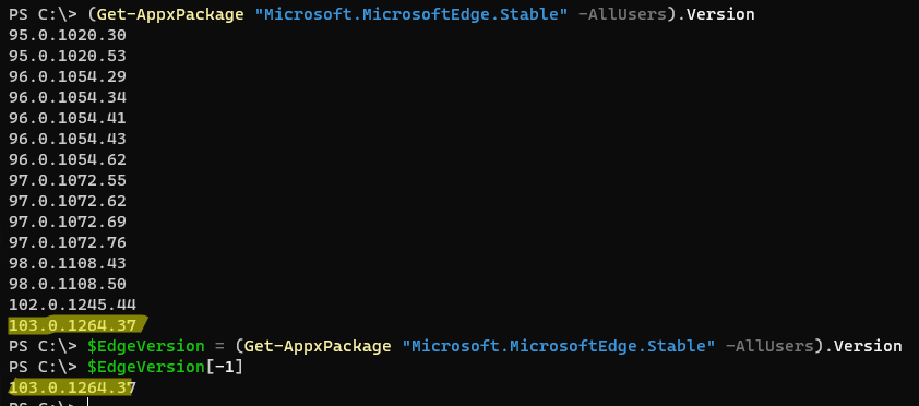 Get-AppxPackage -AllUsers «*edge*»|select Name,PackageFullNameGet-AppxPackage -allusers –Name Microsoft.MicrosoftEdge.Stable_103.0.1264.37_neutral__8wekyb3d8bbwe | Remove-AppxPackage -AllUsers
