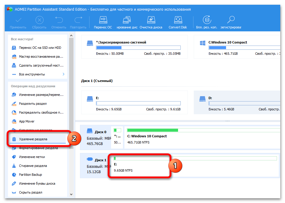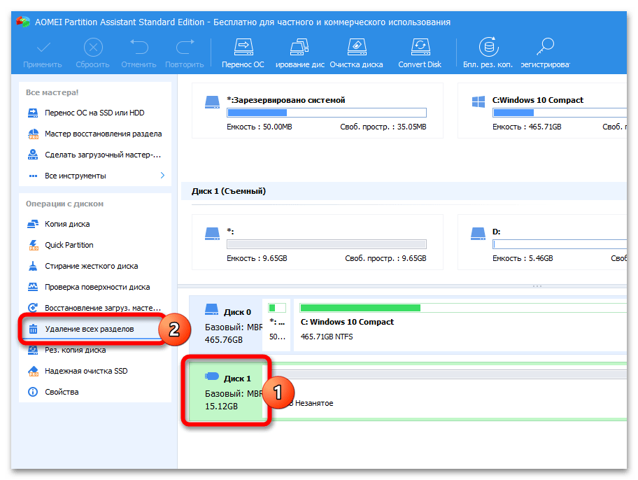 AOMEI Partition Assistant – удобный менеджер разделов жёстких дисков и съёмных накопителей. Чтобы удалить раздел на флешке, выполните следующие действия:
