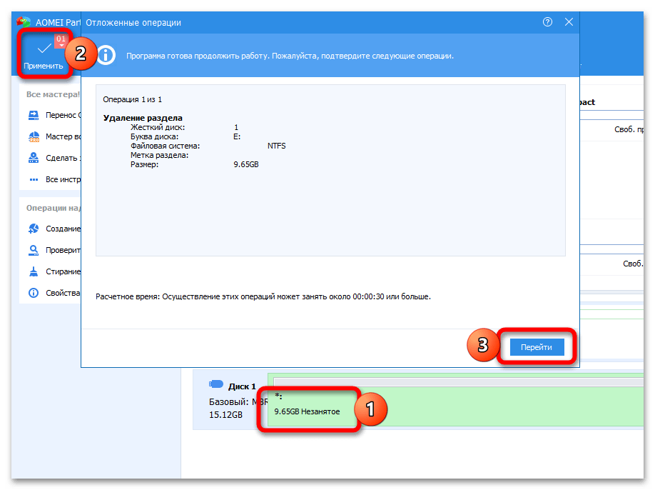 Нажмите на кнопку «Применить» в левом верхнем углу окна программы. Подтвердите выполнение операции, кликните по кнопке «Перейти».