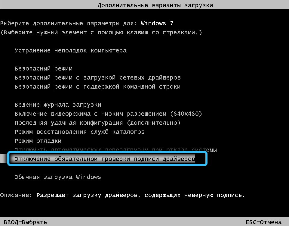 - После перезапуска на дисплее будут предложены все возможные варианты загрузки системы, в этом списке нужно выбрать кнопкой F7 строчку «Отключить обязательную проверку подписи драйверов».