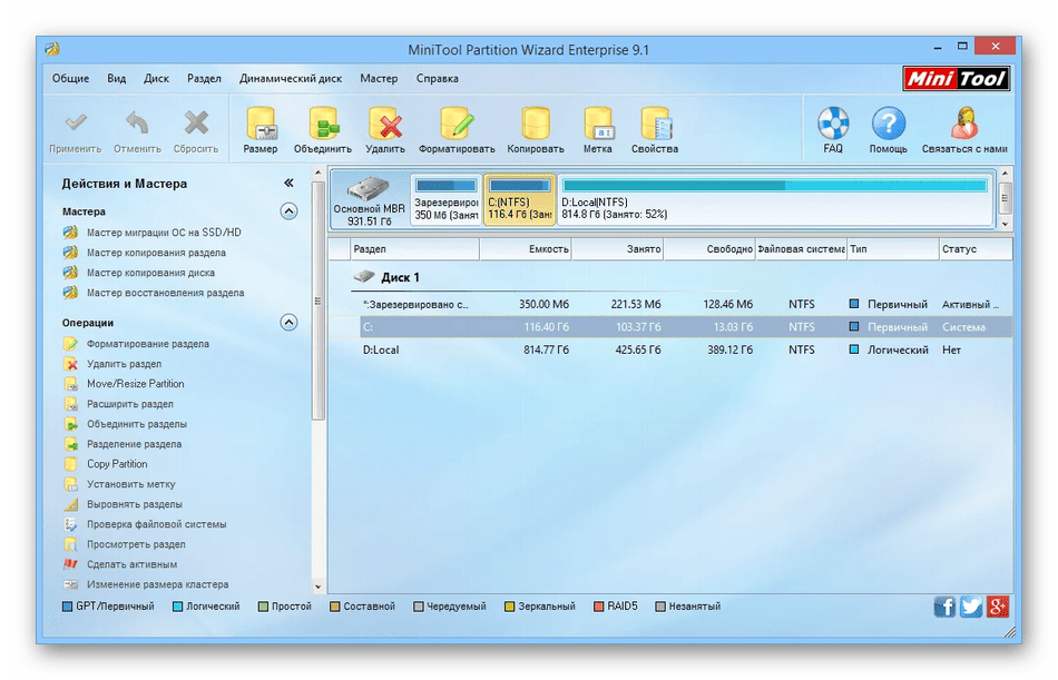 Один из способов увеличения размера диска C: за счет свободного места на диске D: — это использование бесплатных программ для изменения структуры разделов HDD. Такими программами могут быть MiniTool Partition Wizard, EaseUS Partition Master, GParted и другие.