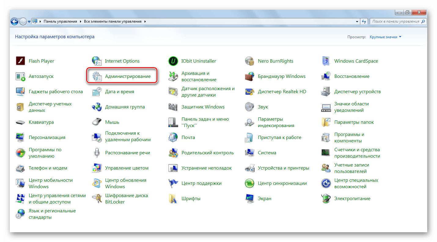 - Перейдите в «Панель управления» (лучше всего сделать это через меню «Пуск»). Выберите там пункт «Администрирование».