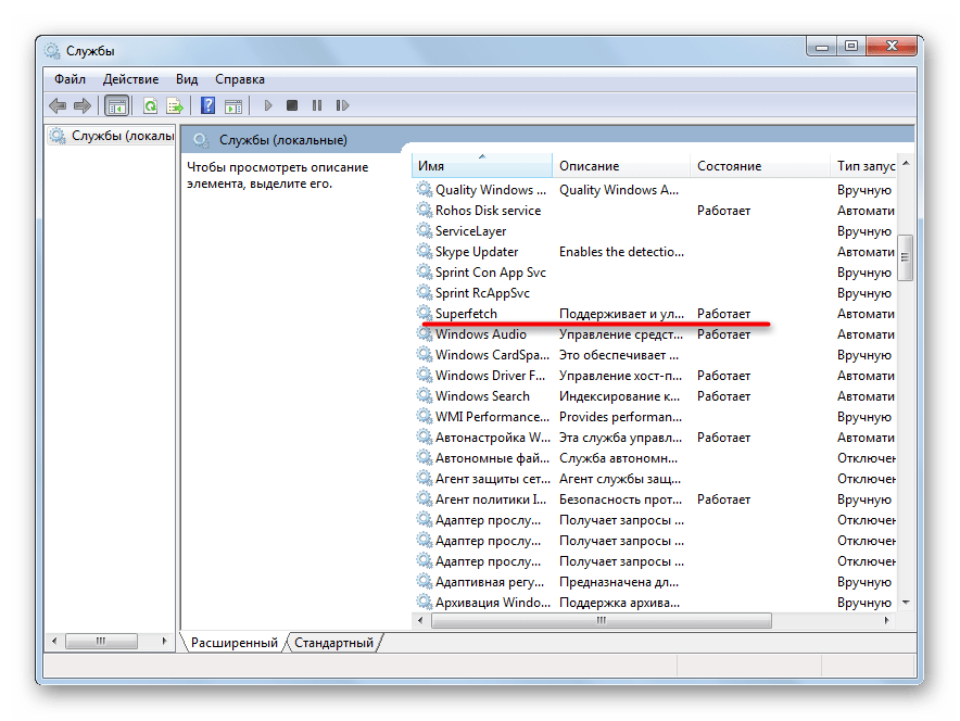 Отыщите службу с названием «Superfetch». В столбце «Состояние» должно быть «Работает», так, как это показано на фото ниже.