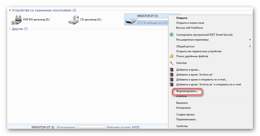 Для начала ее нужно отформатировать. Легче всего сделать это вот так: