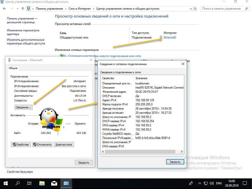Выбрать Ethernet (или беспроводное подключение), перейти в Состояние и выбрать Сведения.