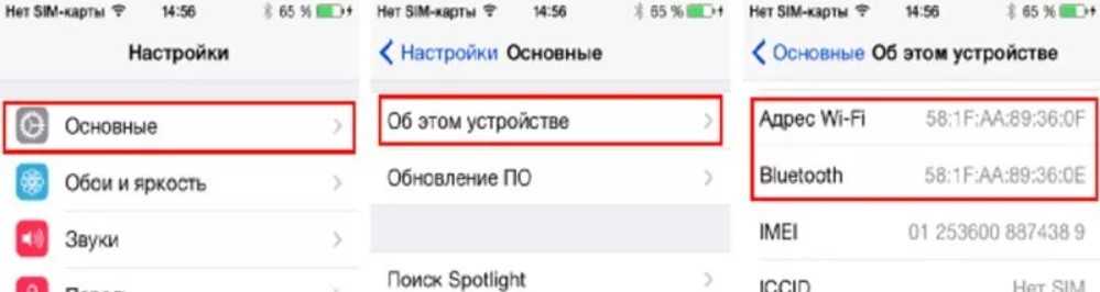 Чтобы выяснить MAC-адрес iPhone, iPad или любого другого устройства на iOS, следует включить Wi-Fi. Затем, перейдите в раздел «Настройки»- «Основные» и выберете «об устройстве». Среди прочей информации будет указан MAC-адрес (графа «Адрес Wi-Fi»).