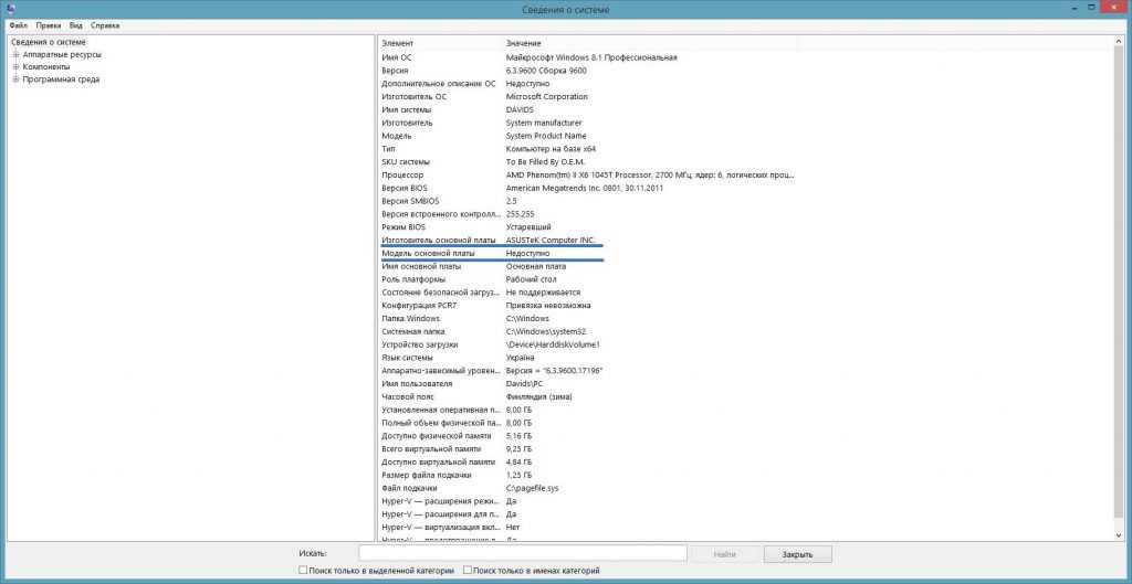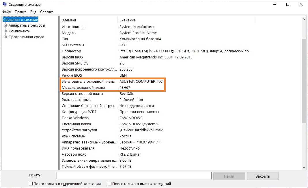 В строках: «Изготовитель системы» и «Модель системы» — будут показаны данные об установленной на компьютере системной плате.
