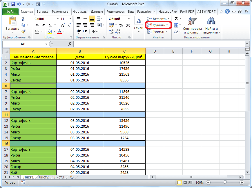 Как видим, после этого, все строки, содержащие пустые ячейки, выделились. Теперь жмем на уже знакомую нам кнопку «Удалить», расположенную на ленте в группе инструментов «Ячейки».