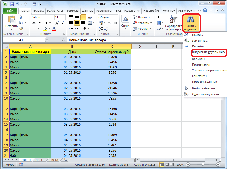Ещё один способ удаления использует выделение группы пустых ячеек. Чтобы использовать этот способ, сначала выделяем всю таблицу. Затем, находясь во вкладке «Главная», кликаем по кнопке «Найти и выделить», которая расположена на ленте в группе инструментов «Редактирование». В появившемся меню, кликаем по пункту «Выделение группы ячеек…».