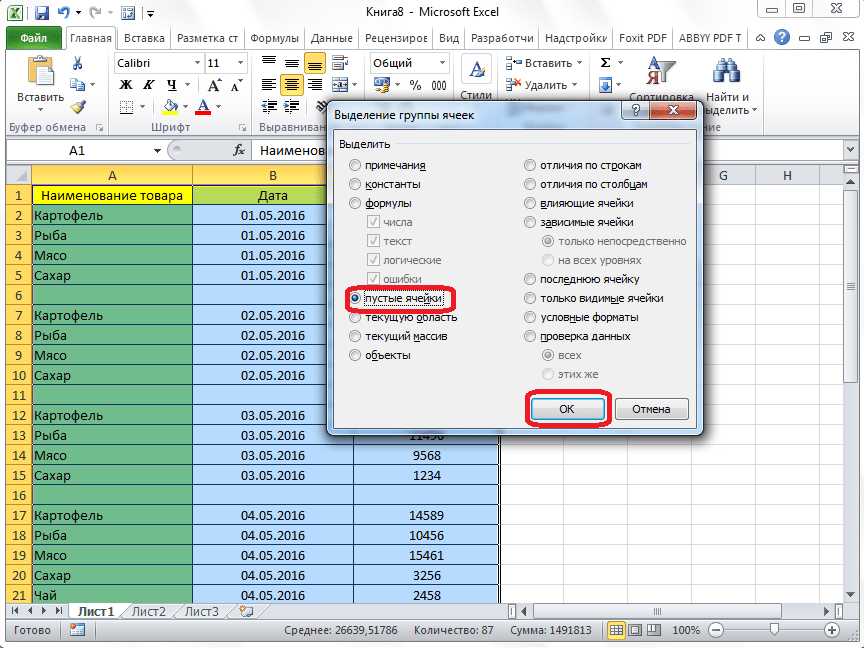 - В появившемся небольшом окне необходимо переставить флажок напротив записи «Пустые ячейки», затем нажать на кнопку «Ок». Все необходимые строки выделены фоном.