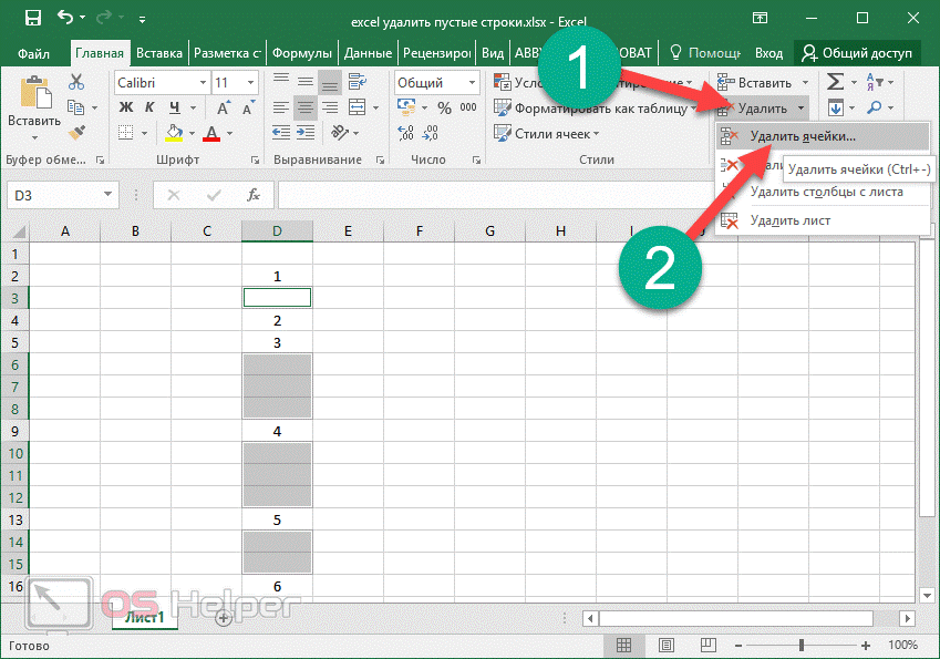 - Затем выберите все отфильтрованные строки и полностью удалите их. Как это делается описано выше. В результате пустая строка (строка 5) будет удалена, все остальные строки (с пустыми ячейками или без них) останутся на месте.