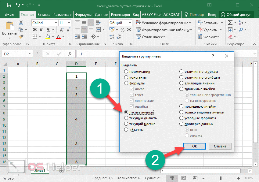 Шаг 5. Далее пользователь должен сам решить, какие ячейки подлежат выделению. В данной ситуации понадобиться выбрать пункт, отвечающий за пустые пространства и нажать «ОК».